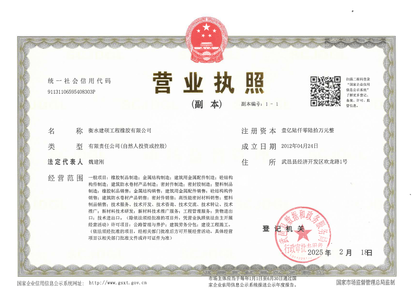 衡水建碩工程橡膠有限公司座落于衡水市濱湖新區,占地面積50000平方米,注冊資金壹億零捌拾萬元整,是生產橡膠支座、盆式支座、充氣芯模、伸縮裝置、止水帶的專業廠家。公司始建于九十年代,經過近二十年的發展壯大,現有員工300多人,其中高級技術人員45人,高級技工103人。